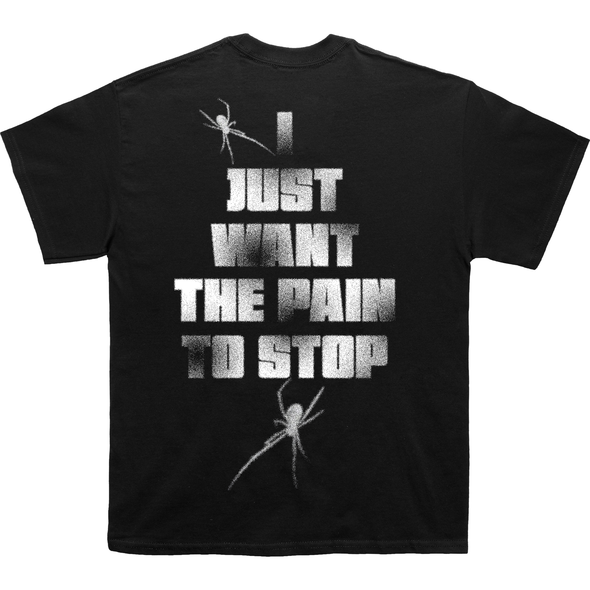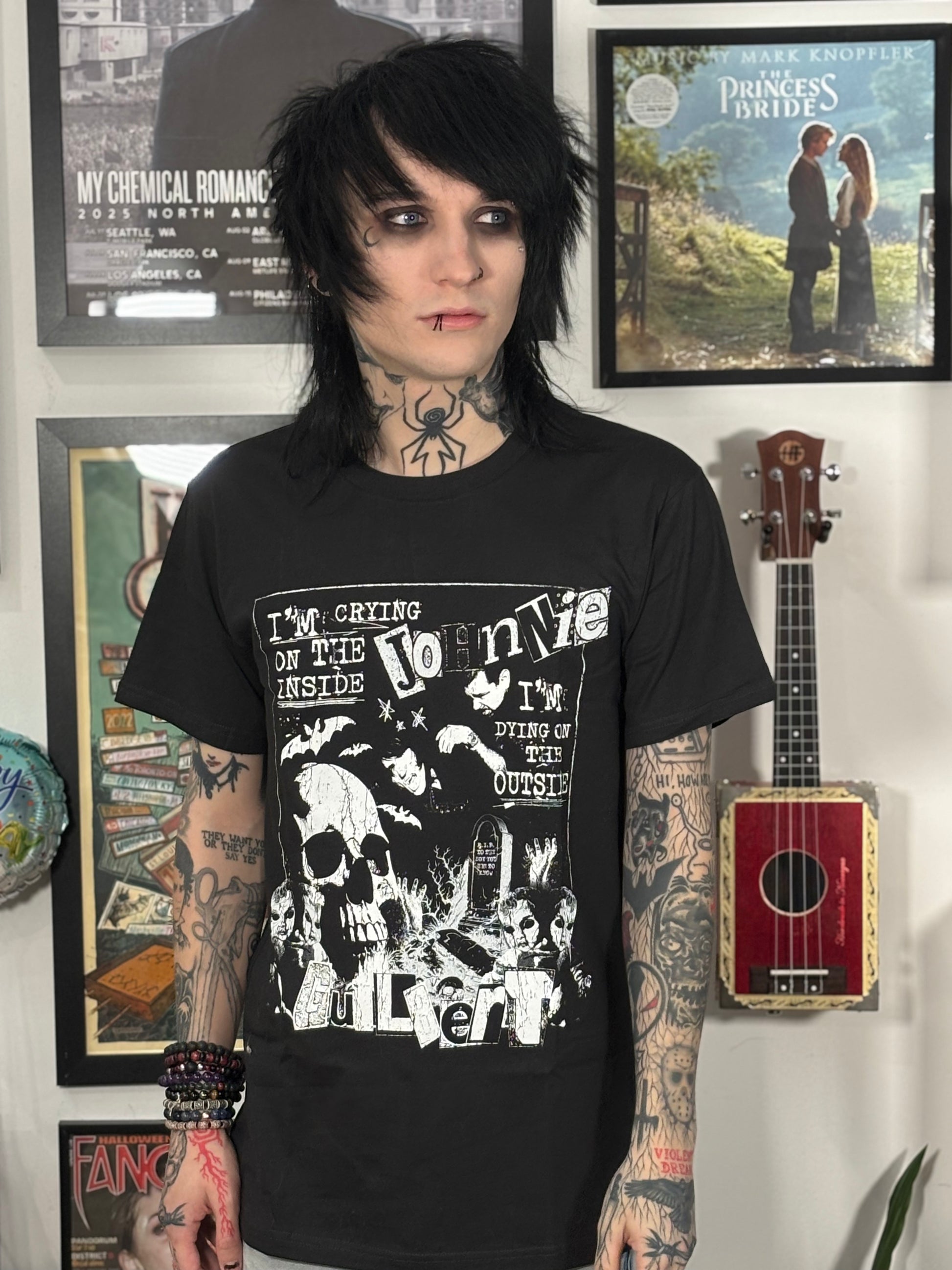 Collage design printed on the front and text on the back of a unisex, black tee.