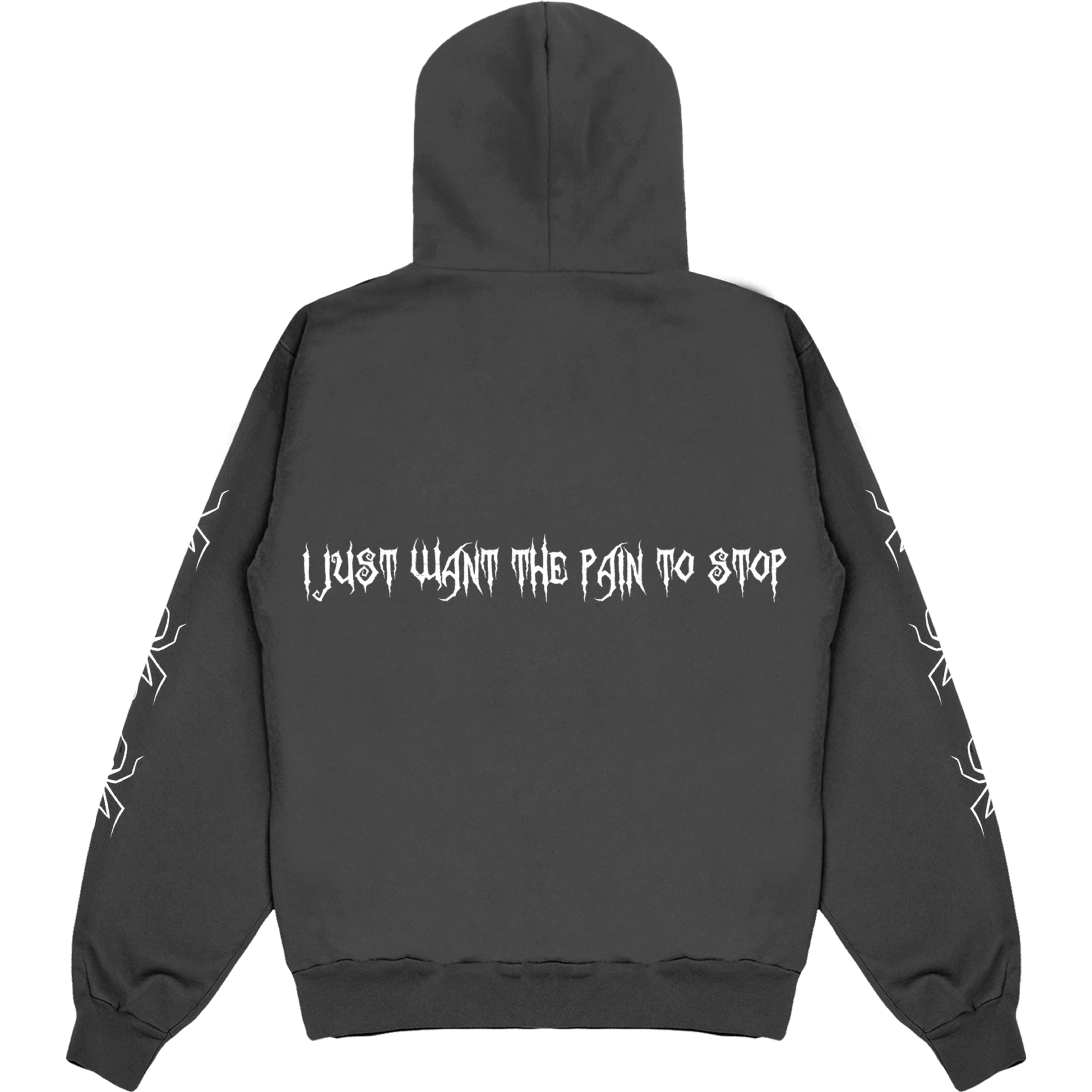 Johnnie Guilbert logo printed on the front, text on the back and spiders down the sleeves of a black, unisex, pullover hoodie.